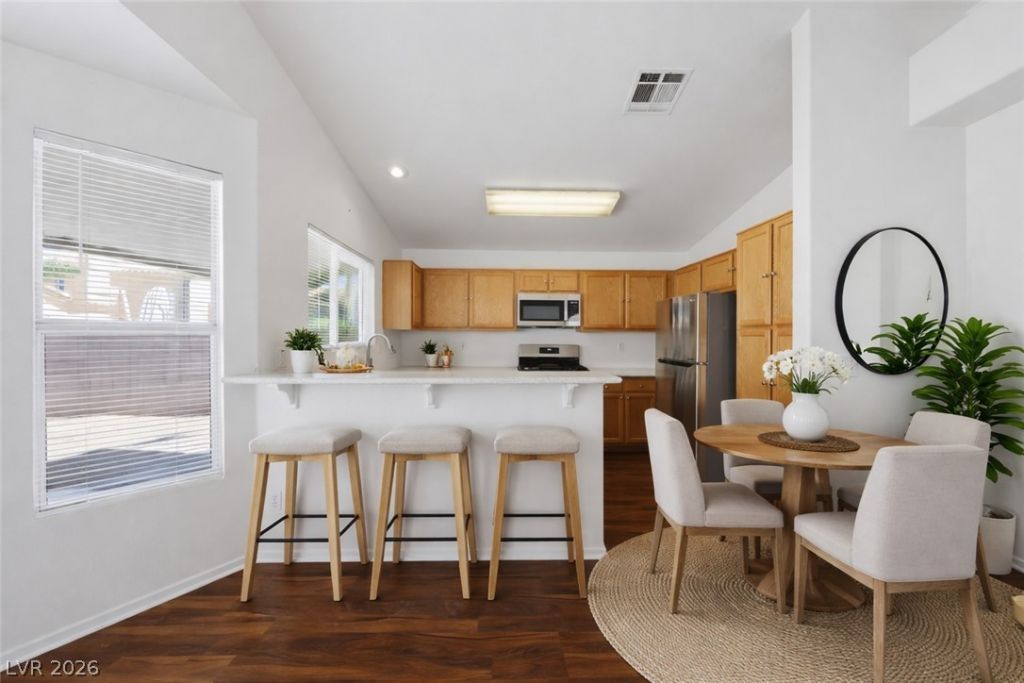 Welcome to this beautiful move-in ready home ideally located near Tivoli Village, Boca Park and Angel Park Golf Club, offering the perfect blend of convenience, lifestyle and comfort. This 3-bedroom, 2-bath residence showcases modern finishes throughout, including wood-look vinyl flooring, fresh interior paint, refreshed kitchen featuring quartz countertops, a new sink, a sleek 5-burner gas range with matching stainless appliances. Major system provides peace of mind, including a new HVAC system, water heater/water softener ensuring both efficiency and comfort for years to come. The primary suite offers a newly remodeled bath, with new toilet & upgraded fixtures. The garage features functional and polished epoxy coated floor. Step outside to refreshed desert landscaping with an updated irrigation system perfect for low-maintenance living. NO HOA. This is the one you've been waiting for; modern, turnkey, and ideally located. Welcome home!